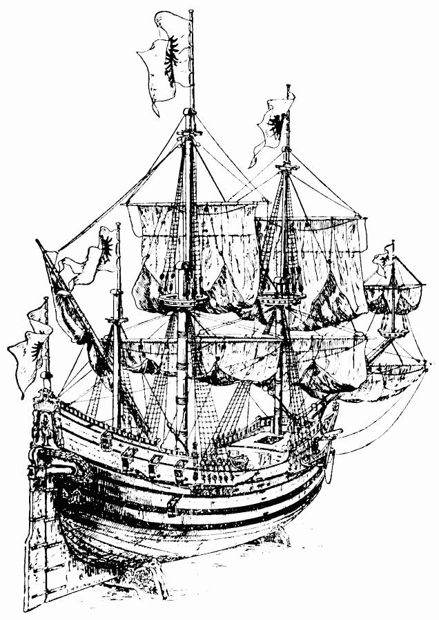 Флейт — это тип голландских судов, который на протяжении ХУ1-ХУШ вв. занимал господствующее положение на всех морях. Первый флейт был построен в 1595 г. в г. Хорне, центре судостроения Голландии, в заливе Зейдер-Зе. Длина этих судов в 4-6 и более раз превышала их ширину, что позволяло им ходить под парусами уже довольно круто к ветру. Повышенная ширина и уменьшенная осадка объяснялись мелководьем голландских портов. Голландцы строили свои суда по тщательно выверенным расчетам и чертежам. В ту эпоху они, безусловно, держали первенство в конструировании и постройке кораблей. Маленькая страна Голландия имела самый многочисленный торговый флот в мире. Мачты превышают длину судна, а реи укорочены, что позволило использовать небольшие узкие паруса, удобные в обращении. Впервые в такелаже флейтов использованы изобретенные в 1570 г. стеньги. Кроме того, именно на голландских флейтах впервые появилась неотъемлемая принадлежность любого современного Судна — штурвал. Еще одно нововведение — сильно зауженные кверху борта и круглая корма. Все это требовалось для максимальной грузоподъемности, максимальной осадки и хорошей мореходности. Парусное вооружение фок- и грот-мачт состояло из фока и грота и соответствующих марселей, а позже (на больших флейтах) и брамселей. На бизань-мачте выше обычного косого паруса поднимали прямой парус крюйсель. На бушприте ставили прямоугольный парус блинд, иногда бом-блинд. Длина судна около 40 м, ширина — 6,5 м, осадка 3-3,5 м, грузоподъемность 350-400 т. Вооружение — 10-20 пушек. Экипаж — 60-65 человек. В силу высокой скорости и большой вместимости использовались главным образом в качестве военно-транспортных судов. Для самообороны на них устанавливали 10-20 пушек.