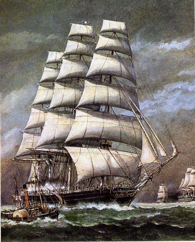 Немало великолепных кораблей построил американский судостроитель прошлого века Дональд Маккей. Любителям парусов хорошо знакомы такие названия, как "Ртэг Хаунд", "Флайинг Клауд", "Флайинг Фиш", "Соверин оф де Сиз", "Увствард Хо", "Лайтнинг" и "Джеймс Вэйнс". В течение трех десятилетий эти парусники не имели себе равных в скорости хода, В марте 1858 года клипер "Соверин оф де Сииз", огибая мыс Горн, показал невиданную дотоле для парусного судна скорость: за одни сутки он прошел 420 миль. Известно, что за всю историю мореплавания лишь 14 парусных судов могли преодолевать за сутки 400 миль, и 13 из них были построены в Бостоне американским судостроителем. Дональд Маккей родился в НоваСкотии в 1810 году. Его детство прошло на верфи, где трудился отец. В 16 лет Дональд поехал в Нью-Йорк учиться судостроению у мастера Исаака Уэбба. После службы на верфях Нью-Йорка и Ныобарипорта он переехал в Бостон, где вместе с кораблестроителем Иноком Тройном открыл новую верфь. Тогда ему было всего 34 года, С 1845 по 1850 год Маккей построил 6 пакетботов, которые способны были совершать рейс из Ливерпуля в Бостон за 12 дней. Причем при хорошем ветре их скорость достигала 21 узла, После этих пяти пакетботов Маккей спустил на воду огромный корабль "Нью Уорд" - самое большое деревянное судно своего времени, воспетое Лонгфелло В поэме "Строительство корабля". За два года до этого Маккей спроектировал деревянный клипер, превосходивший "Нью Уорлд". Его длина составляла 101,5 м, ширина - 16,2 м, глубина трюма - 10 м. Триста тысяч долларов, которые ушли на строительство этого гиганта, Маккею пришлось выложить из своего кармана: никто из судовладельцев Америки и Европы не хотел купить столь огромное судно. Корабль спустили на воду в Бостоне в октябре 1853 года и назвали "Грейт Рипаблик". ЕГО тоннаж достигал 4556 регистровых тонн. На буксире его отвели в Нью-Йорк, где оснастили бегучим такелажем и парусами из белого хлопка, на пошив которых ушло 14 340 погонных метров ткани, а общая площадь парусов составила 6070 квадратных метров. В истории судостроения ни один из парусников мира не имел таких высоких и длинных реев. От палубы до клотика длина второго грота достигала почти70 метров, расстояние между ноками грота-рея равнялось 36,6 метра. "Грейт Рипаблик" был вооружен 4 мачтами корабельной оснастки. В вооружение клипера Маккей ввел новшество, сделав из-за огромной площади нижних парусов разрезные марсели и брамсели. В канун 1854 года клипер под командованием капитана Лохлана Маккея - старшего брата кораблестроителя - должен был сняться из Нью-Йорка в свой первый рейс на Австралию. Но этот рейс парусника так и не состоялся... В ночь после рождества в Нью-Йорке, на набережной Саут-Стрит, где был ошвартован "Грейт Рипаблик", случился пожар - загорелся один из складов. Сильный ветер с полуострова Манхаттан перебросил пламя с горевшего склада на смоленый такелаж клипера. Не прошло и 10 минут, как все четыре мачты корабля превратились в пылающие исполинские факелы. Струи воды из пожарных рукавов не достигали даже высоты салингов. Капитан "Грейт Рипаблик", понимая, какую угрозу представляет его пылающее судно стоявшим рядом парусным кораблям, принял единственно правильное решение - срубить мачты клипера и свалить их за борт в воду. Одна за другой со страшным грохотом рушились огромные мачты. Падая, они в щепки разбивали п