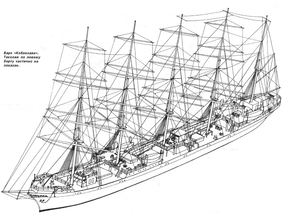 Последний пятимачтовый барк— “Кобенхавн” — был построен шотландской верфью “Рэмэдж энд Фергюсон” по заказу датской Восточно-Азиатской компании уже после Первой мировой войны. По размерам среди пятимачтовиков он занимал среднее положение, зато по праву мог именоваться одним из самых красивых винджаммеров в мире благодаря изящным линиям корпуса и пропорциональности рангоута с несколько увеличенной площадью верхних парусов. Конечно, в конструкции барка не обошлось без технических новинок. Как и “франс-2”, “Кобенхавн” оснастили дизелем (правда, одним, а не двумя). У двухлопастного гребного винта регулируемого шага лопасти могли устанавливаться в положение вдоль потока, что снижало сопротивление при движении под парусами. Такелажные лебедки стали электрическими. Ну и главная особенность: винджаммер был не только грузовым, но и учебным судном. Чтобы уменьшить расходы на содержание экипажа, судовладельцы планировали при штатной команде в 40 — 45 человек брать 16—18 кадетов-практикантов, чей труд можно было не оплачивать. Постепенно, от рейса к рейсу это соотношение менялось, и в свой последний поход “Кобенхавн” отправился, имея на борту всего 16 человек штатной команды и 45 кадетов... После ходовых испытаний парусник в октябре 1921 года отправился в свое первое дальнее — кругосветное! — плавание, продолжавшееся 404 дня. Барк пересек Атлантику, обогнул мыс Горн, посетил Сан-Франциско, Гонолулу, Владивосток, Дайрен и другие города; назад в Европу он вернулся, обойдя мыс Доброй Надежды. Затем последовали подобные рейсы в Аргентину, Австралию, Юго-Восточную Азию... Имея неплохую маневренность при движении под дизелем, “Кобенхавн” стал единственным пятимачтовиком, прошедшим по Суэцкому и Панамскому каналам. Барк успешно эксплуатировался в течение 7 лет. Но его карьера оборвалась трагически. 14 декабря 1928 года он вышел из Буэнос-Айреса и взял курс на зюйд-ост. Судну предстояло в балласте дойти до Австралии, где принять груз — пшеницу — и доставить его в Европу. 21 декабря состоялся сеанс связи с парусником, после чего “Кобенхавн” исчез. Что явилось причиной его гибели — внезапно налетевший шквал, столкновение с айсбергом или громадная “волна-убийца”, встречающаяся в “ревущих сороковых”, —так и останется тайной. Единственными следами происшедшей катастрофы стали 7 скелетов, найденные в 1932 году в пустыне Намиб. По пуговицам с якорями установили, что это— кадеты торгового флота Дании. Значит, по крайней мере одна шлюпка с “Кобенхавна” добралась до берега, но обессилевшие моряки умерли на пустынном африканском берегу от голода и жажды. Но вопрос — почему погиб последний пятимачтовый гигант — так и остался открытым. С.А.БАЛАКИН