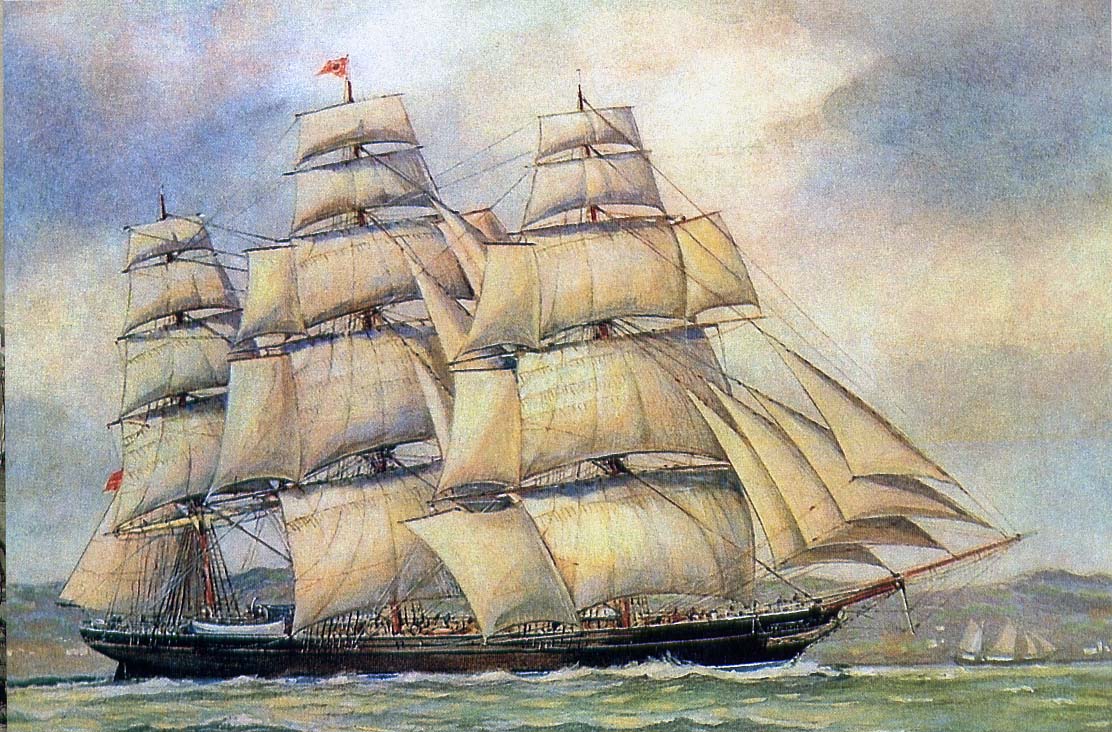 В истории мореплавания клиперы известны с начала прошлого века. Сперва это были тупоносые парусники с плавными кормовыми обводами. Они имели большую парусность, но могли плавать без балласта. Широкая форма корпуса обеспечивала высокую устойчивость. Обладая феноменальной по тем временам скоростью до 14 узлов, они успешно соперничали с военными фрегатами. Но большие торговые и пассажирские клиперы начали строиться только в 40-е годы ХIХ в. После длительных теоретических расчетов американский инженер-судостроитель Джон Гриффит пришел к выводу, что быстроходность судна целиком зависит от формы его корпуса и парусной оснастки, и построил корабль с очень острыми и вогнутыми в носовой части ватерлиниями. Наибольшую ширину корпуса он перенес в кормовую часть. Ниже ватерлинии в поперечном сечении корпус приближался по форме к треугольнику. Самым существенным в этой конструкции было отношение ширины к длине— 1 :6 или 1:7,тоесть длина в шесть-семь раз превосходила ширину судна. Это было необычно. Прежние парусники имели отношение ширины к длине 1:3 или 1:4. Появился термин «длина бежит». Клипера с узким и длинным корпусом, подобно сильным рыбам, рассекали волны. Парусная оснастка на них была многоярусной и самой совершенной. Большая парусность и узкий корпус обеспечивали новым судам бешеные скорости. В дословном переводе с английского клипер означает «стригун». Судно как бы стригло своим легким корпусом верхушки волн. Один за другим сходили со стапелей и завоевывали себе славу на морских путях клипера «Рейнбоу» («Радуга»), «Си Уитч» («Морская ведьма»), «Хризолит», «Сторноуэй», «Лайтнинг» («Молния»), «Ариэль», «Пройссен» («Пруссия»), четырех-мачтовик «Грейт Рипаблик» и знаменитый «Катти Сарк» («Короткая рубашка»). Приписанные к разным портам Америки, Англии, Германии, они получили прозвище «Гончие псы океана». На них ставили, как на скаковых лошадей или рысаков на ипподромах, назначали большие призы, когда, возвращаясь из Гонконга или Фучжоу с грузом чая, клиперы соревновались в скорости, выносливости команд и мастерстве капитанов, умевших выжимать из своих «стригунов» и экипажей все до капли. Гонки клиперов имели целью не только показать высокие мореходные качества кораблей и экипажей. Компании было выгодно доставить чай в Англию поскорее, чтобы он сохранил свой вкус и аромат, а заодно и составить себе рекламу. Победители гонок входили в Ливерпуль или Лондон под восторженные вопли многих тысяч людей. Условия гонок были в деталях разработаны заранее. Во время гонок капитанам предоставлялась полная свобода действий, они были вольны в выборе курса, в заходах в порты. Важен был конечный результат: кто первым придет в Лондон и ошвартуется у причала. Капитану победившего клипера назначался крупный денежный приз. Носивший то же название, что и его предшественник — крупнейший корабль британского флота в ХУII столетии — клипер «Соверин оф де Сиз» был одним из красивейших и наиболее быстроходных кораблей своего времени. И хотя он не выиграл ни одной гонки чайных клиперов, его капитан Доналд Мак-Кэй в спецификации своего судна постоянно указывал скорость 21 узел. Корабль был построен в 1852 г. и имел водоизмещение 2421 т., общую длину 258 футов, ширину 44 фута и 214 футов длину по килю. К сожалению, послужной список этого корабля оказался краток. Выполнив 
